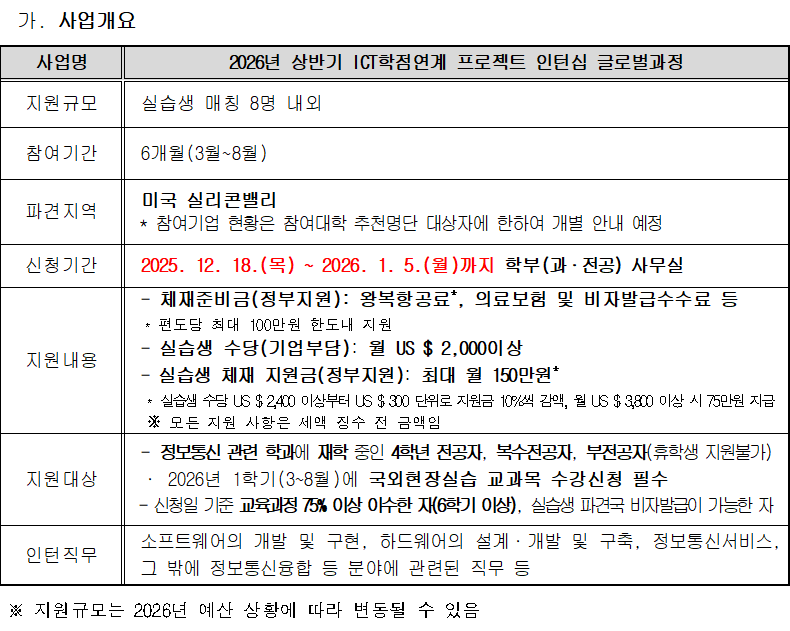 | 2026학년도 상반기 ICT 학점연계 프로젝트 인턴십 글로벌과정 참여학생 모집 안내 | |||
