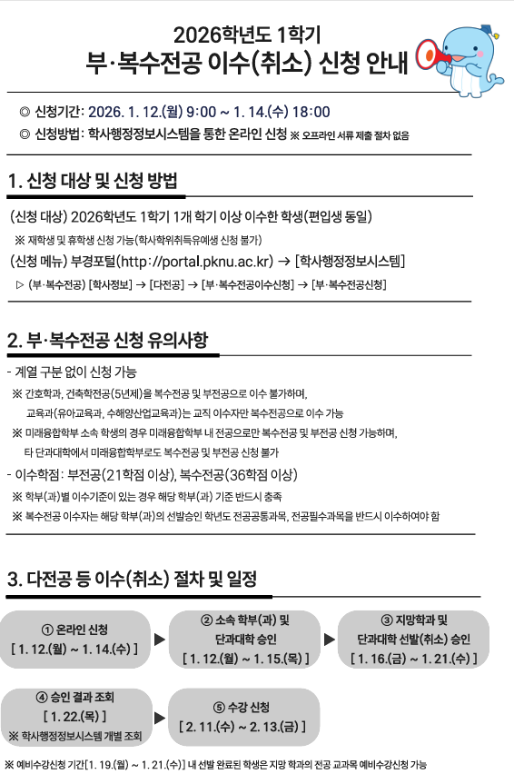 | 첨부파일 | (붙임1)2026-1학기 부·복수전공 이수(취소) 신청 안내문.pdf (붙임2)2026학년도 부전공 및 복수전공 선발기준(예외선발기준).xlsx (붙임3)다전공-학사행정정보시스템 사용설명서.hwp (붙임4)다전공(융합, 학생설계) 및 마이크로전공 편성 목록_2025.12월 기준.xlsx (붙임5)2026-1학기 마이크로전공 이수(취소) 신청 안내.pdf | ||