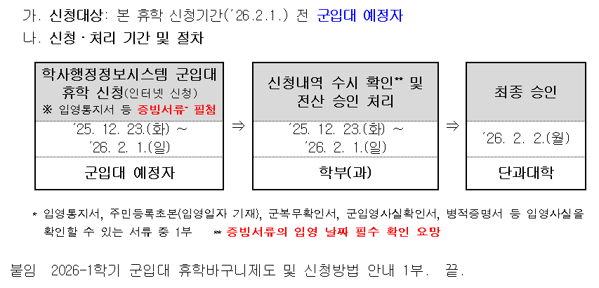 [사전휴학] 2026학년도 1학기 군입대 휴학바구니(사전휴학) 신청 안내