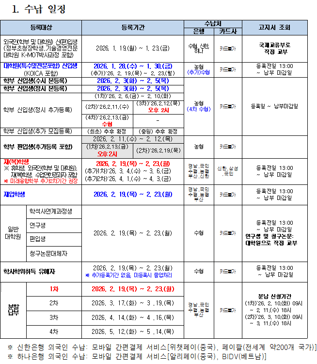 [등록금] 2026학년도 1학기 등록금 납부 기간 및 방법 안내